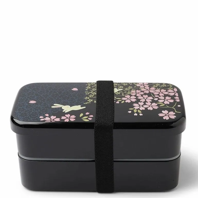 Bento box with 2 compartments. Black with sakura & rabbit design.