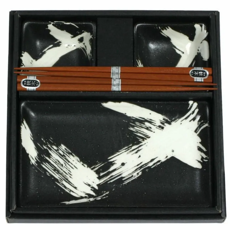Presented in a black gift box for easy gift-giving, this popular Sushi For Two set is perfect for anyone who appreciates great food. Black Brush Stroke Sushi Set includes two 8.75″ x 5″ rectangular plates, two 3.5″ square sauce dishes and two pairs of chopsticks in a black gift box. Great also for holding votive candles or soap in sauce dishes on top of a tray rectangular plate. The perfect housewarming or congratulatory present for your favorite couple. Matching Bowl Set for Two also available [item# G915] as well as the White Brush Stroke Sushi Set [item# J1061].