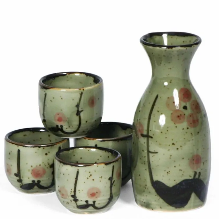 Sake for four! Serving sake from a true sake bottle makes the experience infinitely more enjoyable. This set features a beautiful plum blossom design on one 5 oz. sake bottle and four sake cups, packaged in a black gift box.