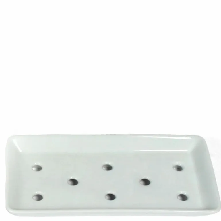 Porcelain plate for sushi cases allows moisture to drain through the holes to keep fish fresh. 8″x 4.25″ Microwave/dishwasher safe. Made in Japan.