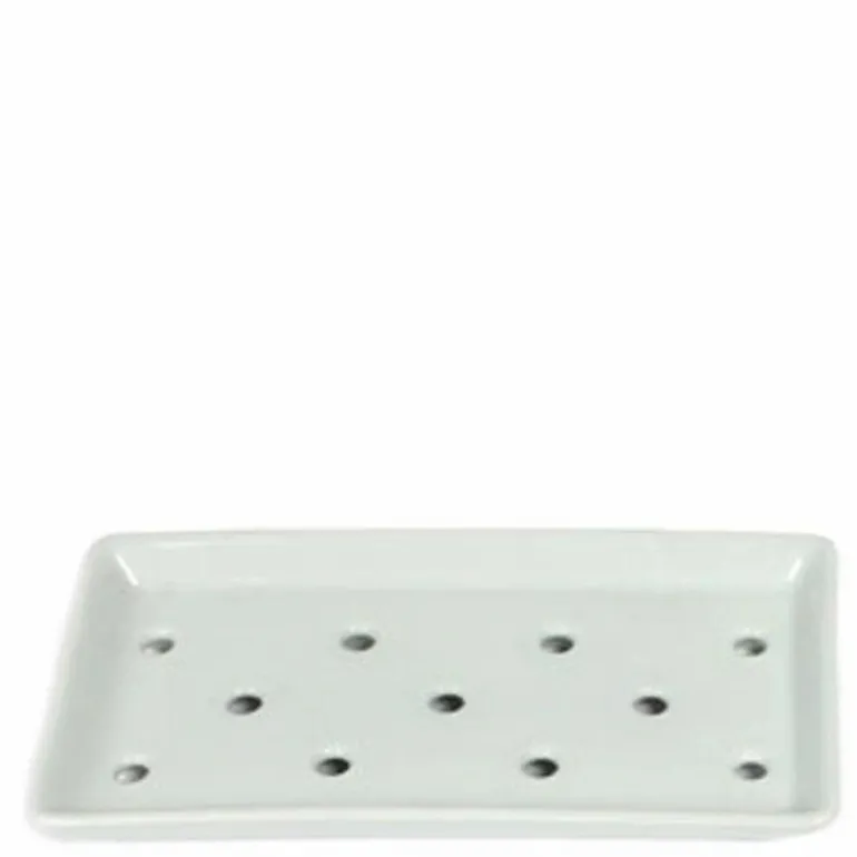 Porcelain plate for sushi cases allows moisture to drain through the holes to keep fish fresh. 8.75″ x 5″ Microwave/dishwasher safe. Made in Japan.
