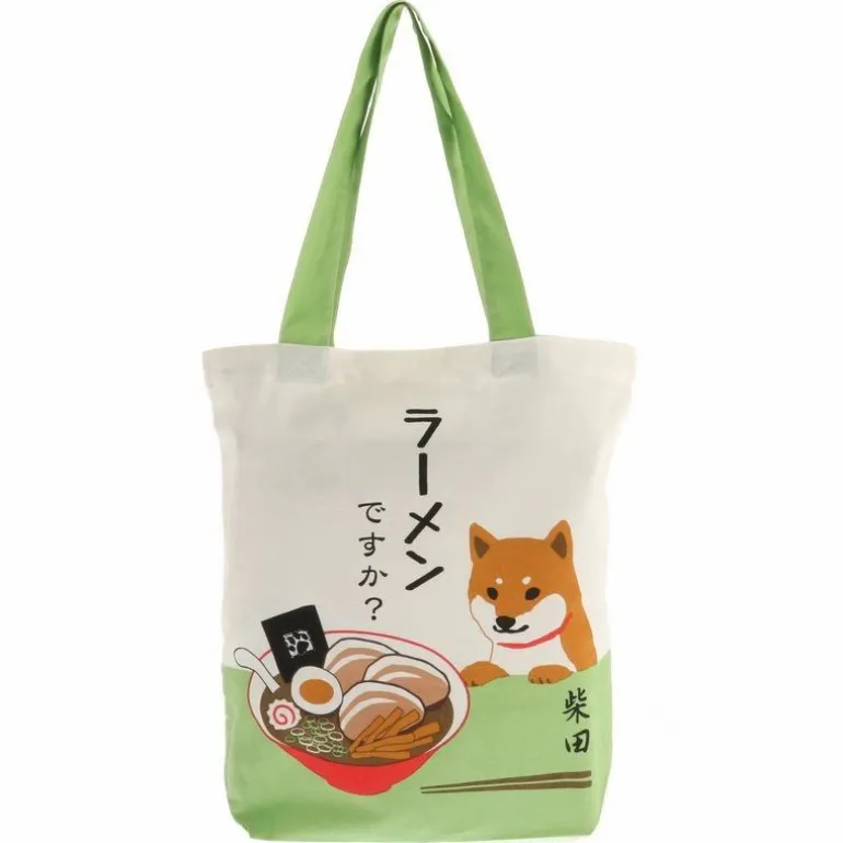 White tote bag with shiba + ramen design.